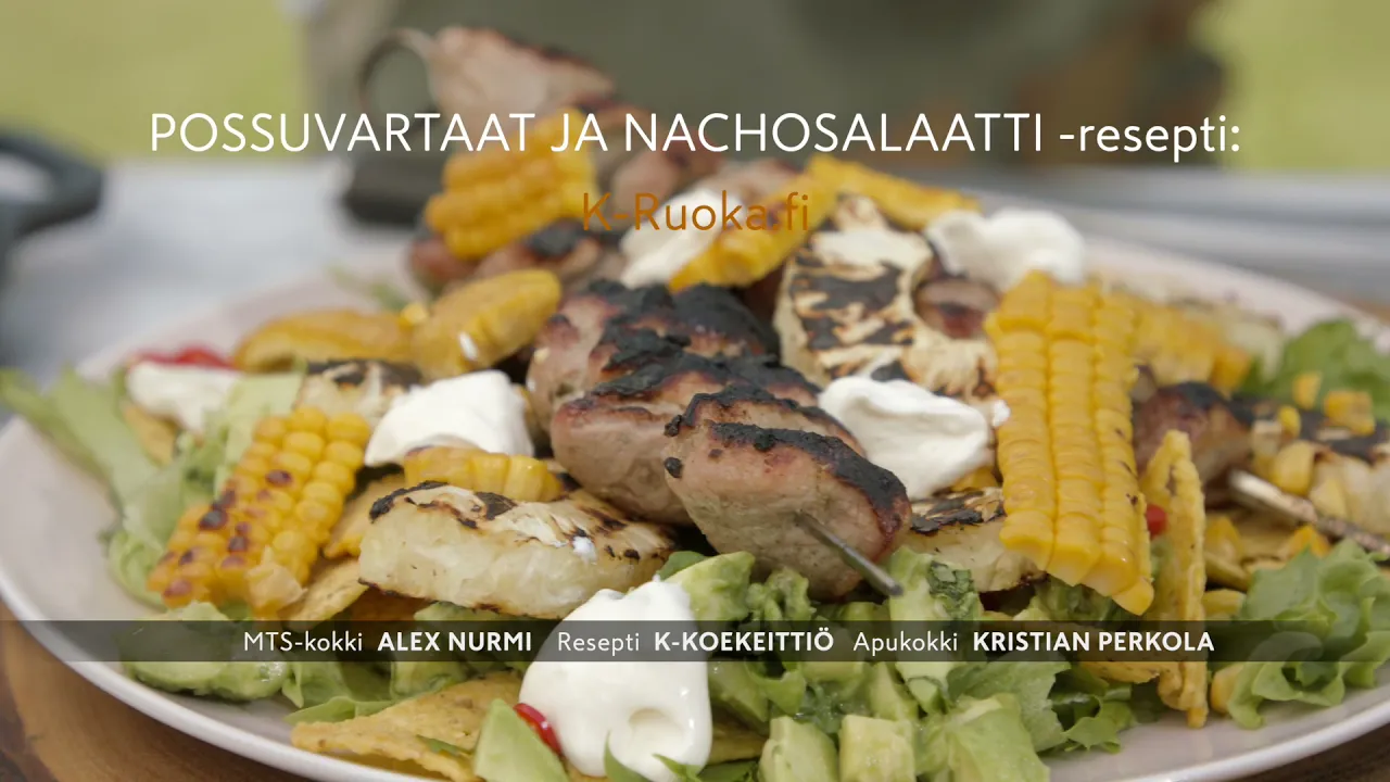 Kokoa salaatin päälle avokadoa, maissia, ananasta ja maissilastuja. Nosta päälle possuvartaat ja koristele chilillä ja korianterilla. Tarjoa ranskankerman kanssa.