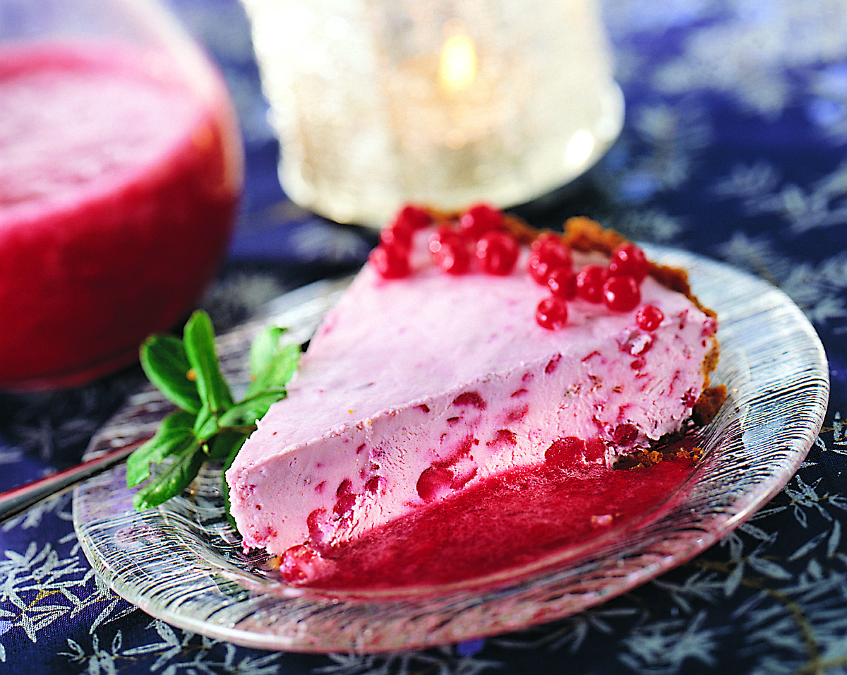 Ota puolukkatorttu huoneenlämpöön noin tunti ennen tarjoilua. Irrota torttu vuoasta ja siirrä tarjoiluvadille. Koristele puolukoilla. Puolukanpunainen rahkatorttu saa olla tarjottaessa hieman kohmeinen.