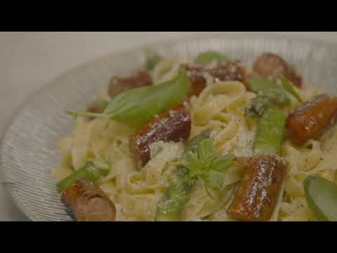 Paista raakamakkaroita öljyssä (1 rkl) pannulla 5–10 minuuttia, kunnes makkarat ovat kypsiä ja saaneet väriä. Lisää parsat ja valkosipuli pannulle. Jatka paistamista vielä muutama minuutti.