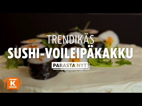 Poista kakku vuoasta ja asettele tarjoiluvadille. Levitä ensin ohut kerros kuorrutetta kakun päälle ja reunoille. Levitä sitten loppu kuorrutus tasaisesti kakun päälle ja reunoille. Koristele kakku kurkulla, valmiilla susheilla, versoilla ja seesaminsiemenillä.