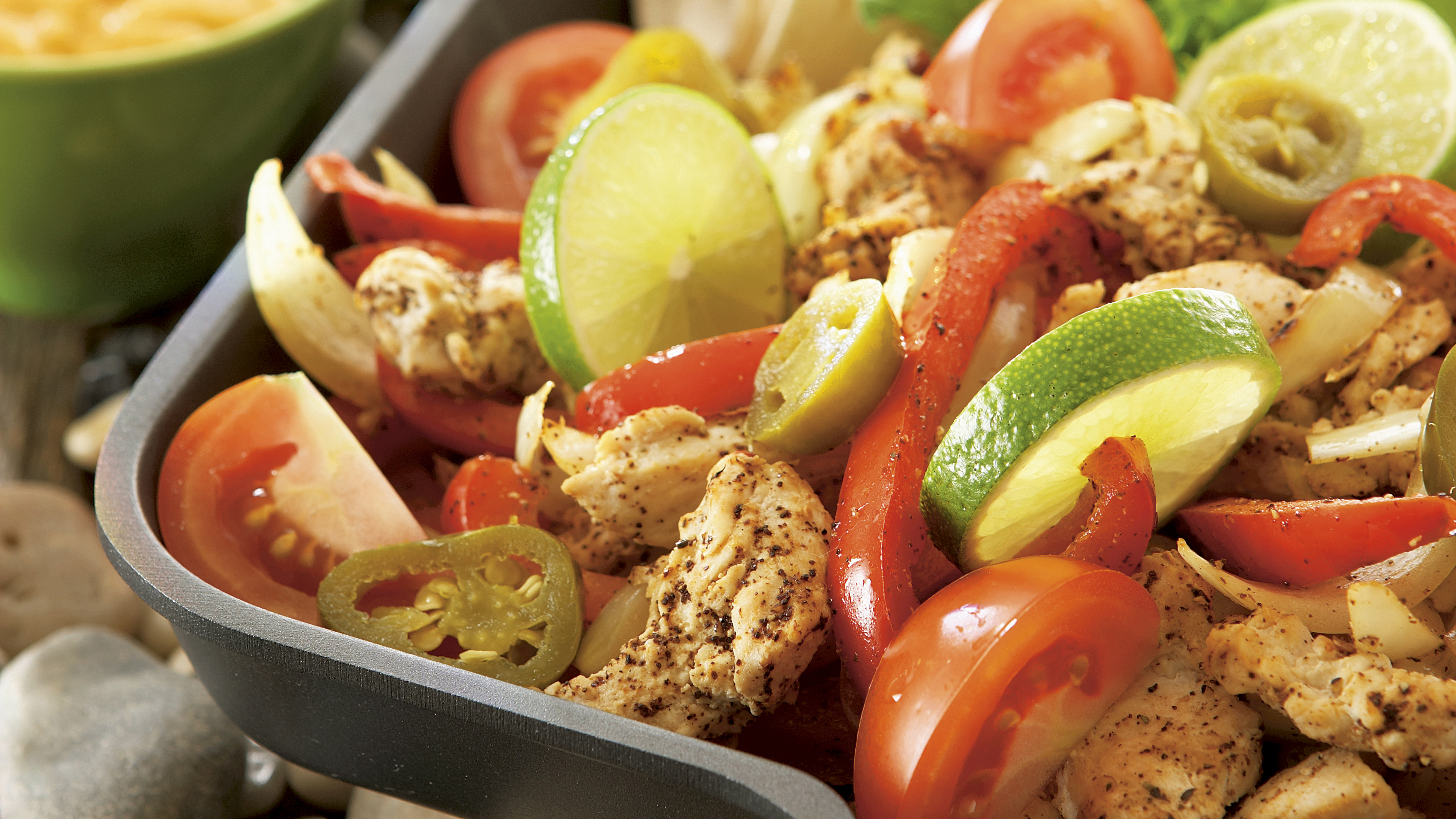 Kuullota öljyssä sipulit, paprika ja valkosipulit. Lisää joukkoon broilerit ja mausta suolalla, oreganolla, pippurilla, chilillä, korianterilla ja limetin mehulla. Kuumenna seosta vielä pari minuuttia.